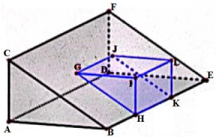 Diketahui 2 buah prisma segitiga, yaitu ABC.DEF dan GHI.JKL. Sisi GHKJ menempel pada sisi BCFE. $\angle BAC = \angle EDF = \angle HIG = \angle KLJ = 90\circ$. AB = 8, BC = 10, CF = 12, KL = 3, LJ = 4, dan EK = KH = HB.