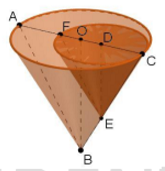 17. Gambar berikut adalah 2 kerucut. Kerucut besar dengan diameter alas AC dan tinggi OB. Kerucut kecil dengan diameter alas CF dan tinggi DE. ABC dan CEF keduanya segitiga sama sisi dengan AB : CE = 3 : 2. Perbandingan volume kerucut kecil dan kerucut besar adalah …