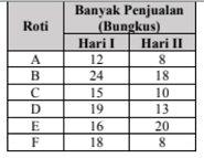 D. 70,95 - Data banyak penjualan roti A, B, C, D, E dan F dalam dua hari berturut-turut pada suatu toko disajikan pada tabel di bawah ini: