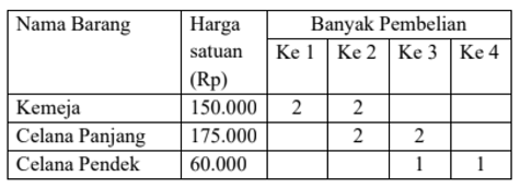 8. Anita membuka toko online yang menjual berbagai jenis pakaian. Setiap pembelian berikutnya dari barang yang sama diberi potongan harga 2% dari harga sebelumnya untuk barang dengan harga lebih dari Rp100.000 dan potongan 1% untuk harga Rp100.000 atau kurang. Tabel berikut adalah data pembelian seorang pelanggan dengan nama akun @juriosnsd23: