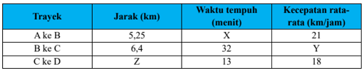 13. Luki bersepeda dari pos A ke pos D melalui pos B dan pos C tanpa berhenti. Data jarak, waktu tempuh, dan kecepatan rata-rata pada tiap trayek disajikan dalam tabel berikut: