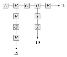 18. Petak-petak A, B, C, D, E, F, G, H, I, dan J pada gambar di samping akan diisi dengan bilangan cacah berbeda sehingga jumlah bilangan dari petak-petak yang segaris adalah 19. Jika petak D diisi bilangan 7 dan petak-petak yang lain diisi bilangan yang kurang dari 10, maka jumlah minimum dari bilangan pada petak A, B, dan C adalah ….