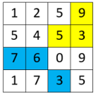 Contoh 3 petak bersisian ditandai dengan warna kuning. Contoh 3 petak yang tidak bersisian ditandai dengan warna biru.