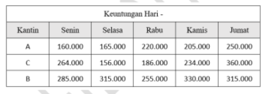 Pak Adi memiliki tiga kantin sekolah. Tabel berikut adalah hasil keuntungan Pak Adi dari hari Senin sampai dengan hari Jumat.