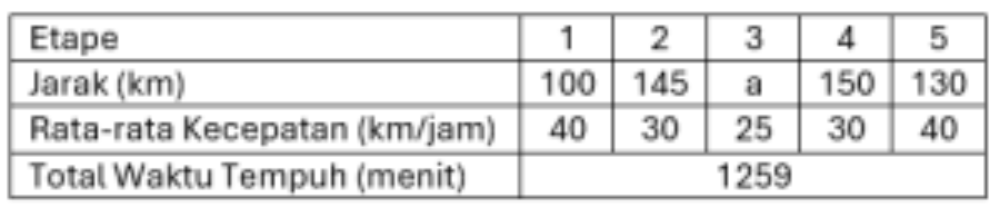 Andi Rahman mengikuti lomba balap sepeda yang menempuh 5 etape. Setiap etape diperoleh data hasil lombanya sebagai berikut. Jarak etape ke tiga adalah … km.