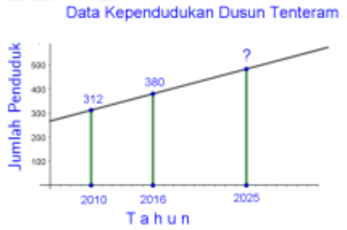 Perhatikan Data Kependudukan Dusun Tenteram berikut ini. Bila kecepatan pertambahan penduduk tetap, maka banyak penduduk Dusun Tenteram pada tahun 2025 adalah … orang.