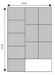 Sebelas (11) persegi panjang kecil ukuran sama ditempel pada kertas berbentuk persegi panjang dengan ukuran 10×15 seperti tampak pada gambar. Luas daerah persegi panjang yang tidak ditempel adalah ….