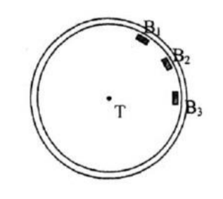 Suatu taman kota dibatasi oleh lintasan lari berbentuk lingkaran (seperti pada gambar) dan tepat di titik pusat taman dibangun tugu $(T)$ yang dihiasi lampu. Di sepanjang tepi bagian dalam taman, diletakkan 12 bangku permanen $(B)$ secara berurutan, sebut $B_{1},B_{2},B_{3},…,B_{12}$. Jarak antara dua bangku yang berurutan dibuat sama (termasuk dari $B_{12}$ ke $B_{1}$). Jarak tugu ke lintasan lari adalah 50 meter. Bakri, Bima dan Budi berlari pada lintasan lari mulai di depan bangku $B_{1}$. Bakri dan Bima berlari searah perputaran jarum jam (dari $B_{1}$ ke arah $B_{2}$), sedangkan Budi berlari mengambil arah yang berlawanan. Jika setelah 20 menit posisi Bakri di depan bangku $B_{7}$, Bima di depan bangku $B_{6}$ dan Budi di depan bangku $B_{4}$, maka jarak total yang telah ditempuh tiga orang ini mendekati … meter (gunakan $\pi =3,14$).