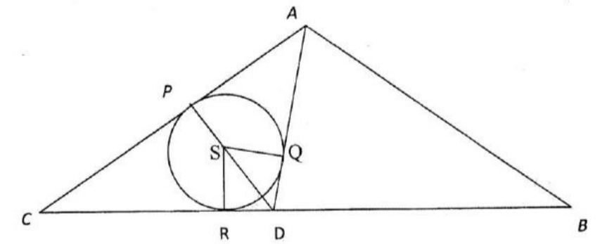 Titik $P, Q, R$ masing-masing adalah titik singgung lingkaran pada sisi-sisi $\Delta ACD$. Diketahui $\angle SDR=60\circ$, panjang $SR$ = panjang $SQ = 1 cm$ dan panjang $RD=\frac{\sqrt{3}}{3} cm$. Jika $\Delta ABC$ sama kaki, maka luas $\Delta ABC$ adalah … $cm^{2}$.- Dua botol yang berukuran sama berisi penuh dengan larutan gula. Rasio kandungan gula dan air pada botol pertama adalah 2:11 dan pada botol kedua adalah 3:5. Jika isi kedua botol tersebut dicampurkan, maka rasio kandungan gula dan air hasil campurannya adalah …