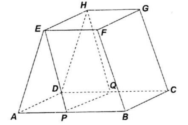 - Diketahui sebuah prisma yang dibentuk oleh bidang-bidang sisi berupa: dua trapesium yang kongruen $ABFE$ dan $DCGH$. Jika $AB$ sejajar $EF$, panjang $AE =$ panjang $BF$, panjang $AB=2$ kali panjang $EF$, panjang $AP=$ panjang $PB=$ panjang $DQ=$ panjang $QC, AD \bot AB$ dan $EH \bot EF$ maka perbandingan volume prisma $APE.DQH$ dan prisma $PBFE.QCGH$ adalah …