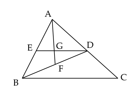 Diketahui $D$ titik tengah sisi $AC, F$ titik tengah sisi $BD$ dan $DE$ sejajar $BC$. Jika $G$ adalah titik potong $AF$ dan $DE$, maka perbandingan $BC : DG$ adalah …