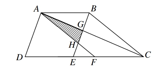 - Bangun datar ABCD di samping adalah trapesium dengan AB sejajar CD. Titik E dan F terletak pada CD sehingga AD sejajar BE dan AF sejajar BC. Titik H adalah perpotongan AF dengan BE dan titik G adalah perpotongan AC dengan BE. Jika panjang AB adalah 4 cm dan panjang CD adalah 10 cm hitunglah perbandingan luas segitiga AGH dan luas trapesium ABCD.