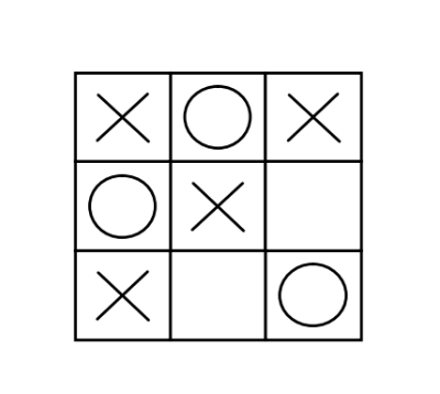 - Ipin dan Upin melakukan permainan Tic Tac Toe dengan sebuah papan berukuran 3 x 3. Ipin mendapat giliran pertama dengan memainkan X. Upin memainkan O. Mereka harus mengisi tanda X atau O pada papan catur secara bergantian. Pemenang pada permainan ini adalah orang pertama yang berhasil menyusun tanda secara horizontal, vertical, atau diagonal. Tentukan banyak posisi akhir yang mungkin, jika Ipin menang pada langkah ke-4. Sebagai contoh, salah satu posisi akhir adalah seperti gambar dibawah.