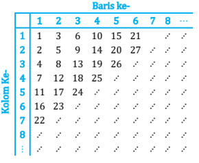 9. Perhatikan susunan bilangan asli pada tabel berikut. Posisi dari bilangan tersebut ditentukan dengan nomor baris dan kolom, serta diagonal (yaitu barisan bilangan yang dibaca dari kiri bawah ke kanan atas). Sebagai contoh, posisi bilangan 19 pada baris ke 3, kolom ke-4, dan diagonal ke-6. Sementara posisi dari bilangan 26 adalah pada baris ke-3, kolom ke-5, dan diagonal ke-7.