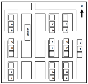 Suatu ketika Musa ditanya oleh temannya, dimana rumahnya ? lalu Musa menjawab bahwa rumahnya dari sekolah ke selatan lalu belok kiri. Pada persimpangan kedua, belok ke kanan dan rumah Musa terletak di sebelah timur jalan, rumah ketiga dari persimpangan. Rumah Musa terletak di rumah dengan label huruf ….