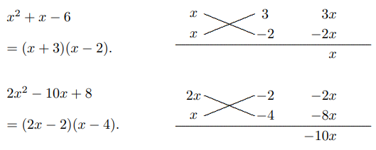 Solusi: Jika diketahui $2x^2+7xy-4y^2=(2x-y)(x+4y)$, maka $$2x^2+7xy-4y^2-3x+6y-2=(2x-y+a)(x+4y+b)$$ Dengan mengeluarkan hasil perkalian tersebut, diperoleh bahwa $$(2x-y+a)(x+4y+b)=2x^2+7xy-4y^2+(a+2b)x+(4a-b)y+ab$$ Dengan membandingkan koefisien, diperoleh sistem persamaan berikut $$a+2b=-3\text{ }\text{ }\text{ }\text{ }\text{ }(6.1)$$ $$4a-b=6,\text{ }\text{ }\text{ }\text{ }\text{ }(6.2)$$ $$ab=-2.\text{ }\text{ }\text{ }\text{ }\text{ }(6.3)$$ Maka $2\times (6.2)+(6.1)$ menghasilkan $9a=9$, yaitu $a=1$. Dari $(6.2),b=6-4a=-2$. Karena $(a,b)=(1,-2)$ memenuhi $(6.3)$, dan ini adalah solusi unik, kami memperoleh $$2x^2+7xy-4y^2-3x+6y-2=(2x-y+1)(x+4y-2).$$