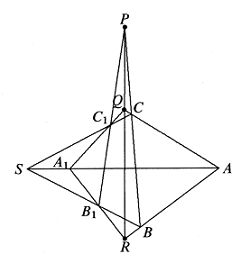 Solusi: Perhatikan garis $PC_1B_1$ sebagai garis transversal terhadap $\Delta SBC$, berdasarkan teorema Menelaus, $$\frac{BP}{PC}\cdot\frac{CC_1}{C_1S}\cdot\frac{SB_1}{B_1B}=1.$$ Karena $QC_1A_1$ melintang ke $\Delta SCA$, maka $$\frac{CQ}{QA}\cdot\frac{AA_1}{A_1S}\cdot\frac{SC_1}{C_1C}=1.$$ Demikian pula, mengingat $RB_1A_1$ melintang ke $\Delta SAB$, maka $$\frac{AR}{RB}\cdot\frac{BB_1}{B_1S}\cdot\frac{SA_1}{A_1A}=1.$$ Mengalikan ketiga persamaan tersebut menghasilkan $$\frac{BP}{PC}\cdot\frac{CQ}{QA}\cdot\frac{AR}{RB}=1.$$ Karena $P,Q,R$ semuanya berada pada ekstensi $BC,CA,AB$, maka $P,Q,R$ pasti kolinear dengan teorema Meneleus invers. - Lingkaran dalam $☉I$ dari $\Delta ABC$ menyinggung sisi-sisi $BC, CA, AB$ masing-masing di $A_1, B_1, C_1$. Misalkan $l$ adalah garis yang melalui $I$ dan $A’,B’,C’$ masing-masing adalah titik-titik simetris $A_1,B_1,C_1$ terhadap $l$. Buktikan bahwa garis-garis $AA’,BB’,CC’$ konkuren.