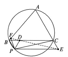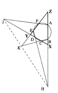 Solusi: Seperti pada gambar, untuk setiap titik $P$ pada bidang, ketidaksaam Ptolemeus memberikan $$PA\cdot BC+PC\cdot AB\ge AC,$$ oleh karena itu $$f(P)=PA\cdot BC+PC\cdot AB+PD\cdot CA$$ $$\ge PB\cdot CA+PD\cdot CA$$ $$=(PB+PD)\cdot CA\ge BD\cdot CA,$$ dimana persamaan berlaku jika dan hanya jika $PABC$ siklik. Oleh karena itu $f(P)$ mempunyai batas bawah $BD\cdot AC$. Akan tetapi, batas ini dapat dicapai jika dan hanya jika $P$ adalah titik perpotongan lingkaran luar $\Delta ABC$ dan ruas garis $BD$, sehingga $P, A, B, C$ bersifat konsiklis. - (Teorema Pascal) Jika suatu segi enam $ABCDEF$ tertulis di dalam suatu lingkaran sedemikian rupa sehingga garis $AB$ dan $ED$ yang dihasilkan berpotongan di $H$, garis $BC$ dan $FE$ yang dihasilkan berpotongan di $K$, dan garis $AF$ dan $CD$ yang dihasilkan berpotongan di $I$, buktikan bahwa $H, K, I$ segaris.