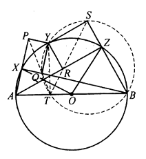 Seperti yang ditunjukkan dalam diagram, Misalkan $T$ adalah kaki garis tegak lurus dari $Y$ ke $AB$, maka, berdasarkan teorema Simson, $P,Q,T$ segaris dan demikian pula $S,R,T$. Maka $$\angle YQB=\angle YTB=\angle YSB=90^o,$$ $S,Y,Q,T,B$ konsiklik, sehingga $$\angle PTS=\angle QTS=\angle QBS=\angle XBZ=\frac{1}{2}\angle XOZ.$$ - Diberikan segi empat cembung $ABCD$ dengan $\angle B+\angle D<180^o$, $P$ adalah titik variabel pada bidang yang sama. Misalkan $f(P)=PA\cdot BC+PD\cdot CA+PC\cdot AB$. Buktikan bahwa $P, A, B, C$ konsiklik jika $f(P)$ mencapai nilai minimumnya.