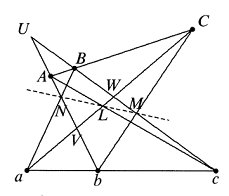 Solusi: Mempertimbangkan segitiga $UVW$ yang dibentuk dengan garis $Ab,aC,Bc$, seperti yang ditunjukkkan pada gambar. Ada lima lintang: $$ALc,CMb,aNB,CBA,abc.$$ Menerapkan teorema Meneleus menghasilkan $$\frac{VL}{LW}\cdot \frac{Wc}{cU}\cdot \frac{UA}{AV}=1,$$ $$\frac{VC}{CW}\cdot \frac{WM}{MU}\cdot \frac{Ub}{bV}=1,$$ $$\frac{Va}{aW}\cdot \frac{WB}{BU}\cdot \frac{UN}{NV}=1,$$ $$\frac{VC}{CW}\cdot\frac{WB}{BU}\cdot\frac{UA}{AV}=1\text{ dan }\frac{Va}{aW}\cdot \frac{Wc}{cU}\cdot \frac{Ub}{bV}=1.$$ Dengan mengalikan tiga persamaan pertama dan kemudian membagi persamaan yang dihasilkan dengan hasil perkalian dua persamaan terakhir, maka diperoleh: $$\frac{VL}{LW}\cdot \frac{WM}{MU}\cdot \frac{UN}{NV}=1.$$ Maka, dengan teorema Meneleus invers, $L,N,M$ kolinear. - $ABCD$ adalah segi empat yang sinar-sinarnya $BA$ dan $CD$ berpotongan di $E$, dan sinar-sinarnya $AD$ dan $BC$ berpotongan di $F$. Misalkan $N, L, M$ masing-masing adalah titik tengah $EF, AC, BD$. Buktikan bahwa $N, L, M$ kolinear.