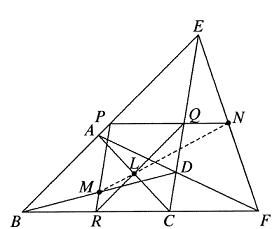 Solusi: Misalkan titik tengah $EB,EC,BC$ masing-masing adalah $P,Q,R$. Maka teorema titik tengah mengindikasi bahwa $Q,L,R$ kolinear, dan $$\frac{QL}{LR}=\frac{EA}{AB}.$$ Demikian pula, $P,M,R$ kolinear, dan $$\frac{RM}{MP}=\frac{CD}{DE}.$$ Di samping itu, $N,Q,P$ kolinear, dan $$\frac{PN}{NQ}=\frac{BF}{FC}.$$ Menerapkan teorema Meneleus ke $\Delta EBC$ dan lintang $ADF$ maka memberikan $$\frac{EA}{AB}\cdot\frac{BF}{FC}\cdot \frac{CD}{DE}=1,$$ oleh karena itu $\frac{QL}{LR}\cdot \frac{RM}{MP}\cdot\frac{PN}{NQ}=\frac{EA}{AB}\cdot\frac{CD}{DE}\cdot\frac{BF}{FC}=1$. Dengan menerapkan teorema Meneleus invers ke $\Delta PQR$ dan tiga titik $M,L,N$, kesimpulan $M,L,Q$ kolinear terbukti.