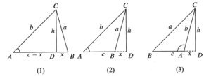 (i) Ketika $\angle A$ lancip, seperti yang ditunjukkan pada gambar (1) atau (2), maka $$a^2=h^2+x^2=(b\sin A)^2+(c-b\cos A)^2$$ $$=b^2\sin^2 A+c^2+b^2\cos^2 A-2bc\cos A$$ $$=b^2+c^2-2bc \cos A$$