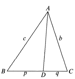 Seperti yang ditunjukkan pada gambar, menerapkan aturan kosinus pada $\Delta ABD$ dan $\Delta ABC$ memberikan $$\frac{c^2+p^2-AD^2}{2pc}=\cos B=\frac{a^2+c^2-b^2}{2ac}.$$ Perhatikan bahwa $a=BC=p+q$, oleh karena itu $$AD^2=c^2+p^2+\frac{b^2p-c^2p}{a}-pa$$ $$=\frac{(p+q)c^2+b^2p-pc^2}{a}+p^2-(p+q)p$$ $$=\frac{b^2p+c^2q}{p+q}-pq$$