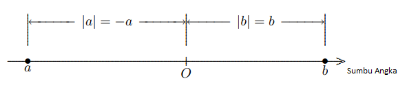 \end{array} \right.$$ Secara geometris, setiap bilangan riil a dilambangkan dengan sebuah titik pada sumbu bilangan, dan nilai absolut $a$ adalah jarak titik yang mewakili $a$ dari titik asal sumbu bilangan.