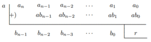 Divisi Sintetis. Jika pembagi $g(x) = x − a$, dengan $a$ adalah konstanta, maka $q(x)$ adalah polinomial berderajat $n − 1$ jika derajat $f(x)$ adalah $n$, dan sisa $r$ adalah konstanta. Tuliskan $$f(x)=a_nx^n+a_{n-1}x^{n-1}+…+a_1x+a_0,$$ $$q(x)=b_{n-1}x^{n-1}+b_{n-2}x^{n-1}+…+b_1x+b_0.$$ Karena $$f(x)=(x-a)(b_{n-1}x^{n-1}+b_{n-2}x^{n-1}+…+b_1x+b_0)+r$$ $$=b_{n-1}x^n+(b_{n-2}-ab_{n-1})x^{n-1}+(b_{n-3}-ab_{n-2})x^{n-2}+…+(b_0-ab_1)x-ab_0+r,$$ dengan membandingkan koefisien $f(x)$, kita memperoleh $$b_{n-1}=a_n,b_{n-1}=a_{n-1}+ab_{n-1},…,b_0=a_1+ab_1,r=a_0+ab_0.$$ Dengan demikian diperoleh tabel operasi sebagai berikut: