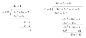 (ii) Jika $f(x) = 3x^4 −5x^3 +x^2 + 2$ dibagi dengan $x^2 + 3$, carilah hasil bagi dan sisanya dengan pembagian bersusun.Solusi: Dengan pembagian panjang berikut: