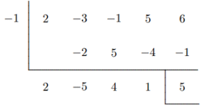 Catatan: Silakan bandingkan pembagian panjang untuk bilangan bulat dan pembagian untuk polinomial, apa saja persamaannya dan apa saja perbedaannya? - Gunakan pembagian sintetis untuk mencari hasil bagi dan sisa dari polinomial $2x^4 − 3x^3 − x^2 + 5x + 6$ jika dibagi dengan $x + 1$.