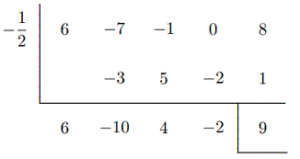 Solusi: Dengan menggunakan pembagian sintetis untuk melakukan pembagian $(6x^4-7x^3-x^2+8)\div (x+\frac{1}{2})$: