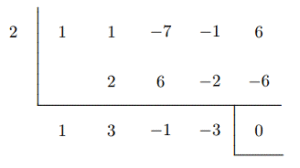 Solusi: Dari Teorema IV, jika $f(x) = 0$ memiliki akar-akar rasional, maka akar-akar tersebut pastilah akar integral, dan berada dalam himpunan $S = {±1, ±2, ±3, ±6}$. Karena $f(1) = f(−1) =0$, berdasarkan teorema faktor, $f$ memiliki faktor $(x − 1)$ dan $(x + 1)$. Untuk memeriksa bilangan-bilangan lain dalam $S$, dengan pembagian sintetis,