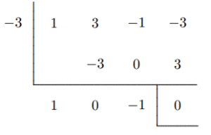 Oleh karena itu, hasil bagi $q_1(x)$ dari $f(x)$ jika dibagi dengan $(x−2)$ adalah $x^3 + 3x^2 −x−3$, sisanya $0$, sehingga $x−2$ adalah faktor ketiga dari $f(x)$. Selanjutnya, kita periksa faktor $x+3$.
