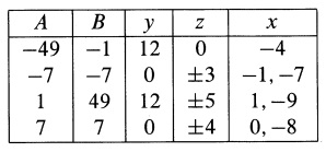 \end{array} \right.$$ Misalkan $A = 2z^2 – 25 – 2y, B = 2z^2 – 25 + 2y$, solusi untuk $(y, z)$ dan kemudian untuk $x$ diperoleh dengan mudah seperti yang ditunjukkan pada tabel berikut: