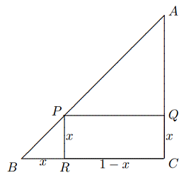 Solusi: Misalkan $BR = x$, maka $BR = PR = QC = x$ dan $RC = PQ = AQ = 1 − x$.
