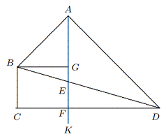 Solusi: Misalkan $AK$ berpotongan dengan $CD$ di $F$ dan $BG ⊥ AK$ di $G$. Maka $\Delta ABG$ dan $\Delta ADF$ keduanya merupakan segitiga siku-siku sama kaki, jadi $$BG = AG, F D = AF.$$ Karena $BCFG$ adalah persegi panjang, $FD = AF > AG = BG = CF$, jadi $$FD>\frac{1}{2}(CF+FD)=\frac{1}{2}CD,$$ $$∴ EF =\frac{FD}{CD}\cdot BC>\frac{1}{2}BC.$$ Karena $BC + CF = FD$, kita memiliki $$CD = CF + F D = 2F D − BC > 2(F D − EF) = 2(AF − EF) = 2AE,$$ yaitu $AE<\frac{1}{2}CD$. - Untuk $\Delta ABC$, misalkan $a = BC, b = CA, c = AB$. Jika $b < \frac{1}{2}(a + c)$, buktikan bahwa $∠B <\frac{1}{2}(∠A + ∠C)$.