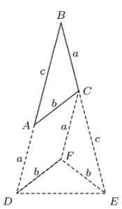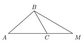 Solusi: Mengingat $∠A + ∠B + ∠C = 180◦$, $$∠B <\frac{1}{2}(∠A + ∠C) \Longleftrightarrow ∠B < 60◦.$$ Sekarang, buatlah segitiga sama kaki $BDE$ dengan memanjangkan $BA$ ke $D$ dan memanjangkan $BC$ ke $E$, sehingga $BD = c +a,$ $BE = a + c$. Selanjutnya, kita buat jajargenjang $ACFD$ sehingga $AC || DF, AD || CF$, maka $$\Delta BAC \cong \Delta CFE, ∴ FE = AC = FD = b.$$ Dari $DE < DF + FE = 2b < a + c$, maka $DE < BE = BD,$ Oleh karena itu, $∠B < ∠E$, yaitu $2B < 180◦ − B$, atau $∠B < 60◦$. Kesimpulannya adalah terbukti. - Diketahui sisi terpanjang $AC$ dari $\Delta ABC$ memenuhi persamaan $AC > BC$. Jika titik $M$ berada pada perpanjangan $AC$ sehingga $CM = BC$. Buktikan bahwa $∠ABM > 90◦$.