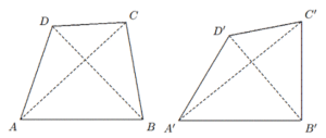 Solusi: $∠AC > BC$ menyiratkan $∠ABC > ∠A$. Hubungkan $BM$. Kemudian $$∠ABM = ∠ABC + ∠CBM$$ $$=\frac{1}{2}∠ABC +\frac{1}{2}∠ABC +\frac{1}{2}∠ACB$$ $$=\frac{1}{2}∠ABC −\frac{1}{2}∠A + 90◦ > 90◦.$$ Jadi, $∠ABM$ tumpul. - Diketahui dua segiempat cembung $ABCD$ dan $A’B’C’D’$ memiliki sisi-sisi yang bersesuaian sama besar, yaitu $AB = A’B’, BC = B’C’$, dst. Buktikan bahwa jika $∠A > ∠A0,$ maka $∠B < ∠B’, ∠C > ∠C’, ∠D < ∠D’$.