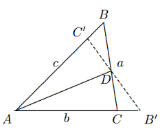 Solusi: Misalkan $BC = a, CA = b, AB =c$. Tanpa mengabaikan keumuman, kita dapat mengasumsikan bahwa $a ≤ b ≤ c$. Misalkan $AD$ adalah garis bagi sudut $∠BAC, B’, C’$ masing-masing adalah titik-titik simetris $B, C$ pada garis $AD$, maka $C’$ berada pada ruas garis $AB$ dan $B’$ berada pada perpanjangan $AC$, seperti yang ditunjukkan pada gambar.