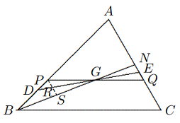 Misalkan suatu garis sembarang yang melalui $G$ memotong $AB$ dan $AC$ masing-masing di titik $D$ dan $E$. Jika garis $DE$ sejajar dengan $BC$, maka $$[ADE]=\left(\frac{DE}{BC}\right)^2[ABC]=\frac{4}{9}[ABC],\text{ maka}$$ $$|[ADE] − [DBCE]| =\left(\frac{5}{9}-\frac{4}{9}\right)[ABC]$$ $$=\frac{1}{9}[ABC],\text{ kesimpulannya benar.}$$ Ketika $DE$ tidak sejajar dengan $BC$, katakanlah $D$ berada di antara $P$ dan $B$ dan $E$ berada di antara $Q$ dan $N$, di mana $PQ || BC$ dan $N$ adalah titik tengah $AC$, seperti yang ditunjukkan pada gambar, kita menunjukkan bahwa $$|[DBCE] − [ADE]| < |[PBCQ] − [APQ]| =\frac{1}{9}[ABC]$$ di bawah ini. Karena $∠DPG > ∠PQA$, kita dapat memperkenalkan $PS || AC$, yang memotong $DE$ dan $BN$ masing-masing di $R$ dan $S$. Maka $\Delta PRG \cong \Delta QEG$ dan $\Delta RSG \cong \Delta ENG$, sehingga $$[PRG] = [QEG] \text{ dan } [RSG] = [ENG].$$ Oleh karena itu $[DBCE] = [PBCQ] − [PDG] + [QEG] < [PBCQ]$ dan $[ADE] =