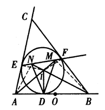Demikian pula, $B,F,M,I,D$ konsiklik. Oleh karena itu, $$\angle ANB=\angle AEI=90^o,\angle AMB=\angle BFI=90^o.$$ Maka $M,N$ keduanya berada pada lingkaran dengan mengambil $AB$ sebagai diameternya. Mengambil $O$ sebagai titik tengah $AB$, maka $\angle MON=2\angle MAN=2\angle MBN=\angle MAN+\angle MBN=\angle NDI+\angle MDI=\angle MDN$, maka $M,N,D,O$ konsiklik, jadi lingkaran luar $\Delta MND$ melalui suatu titik tetap $O$.