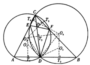 Solusi: Misalkan $O_1,O_2,O_3,O_4$ menjadi pusat lingkaran segitiga $ADE,ADC,DBF,DBC$ masing-masing. Maka $O_1O_2$ berada pada garis bagi tegak lurus $AD$ dan $O_3O_4$ berada pada garis bagi tegak lurus $DB$.