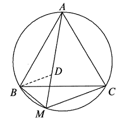 Solusi: Menghubungkan $PR,OR$. Maka $OR=RS$ menyiratkan bahwa $\angle SOR=\angle PSR=12^o$, maka $$\angle SPR=6^o$$ Karena $\frac{x}{2}=\angle PRQ=\angle SPR+PSR=18^o$, oleh karena itu $x=36$, jawaban nya adalah (A). - Misalkan $\Delta ABC$ adalah segitiga sama sisi yang tertulis dalam sebuah lingkaran, dan misalkan $M$ adalah sebuah titik pada busur $BC$. Buktikan bahwa $MA=MB+MC$.
