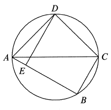 Solusi: Sudah jelas bahwa $AM>CM$. Pada $AM$ ambil titik $D$ sehingga $AD=CM$. Itu sudah cukup menunjukkan bahwa $MB=MD$. Karena $AB=BC,AD=CM$ dan $\angle BAM=\angle BCM$, $$ ∴\Delta ABD\cong \Delta CBM.$$ Maka, $BM=BD$ dan $\angle ABD=\angle CBM$. Untuk $\Delta BMD,\angle DBM=\angle ABC=60^o$, Jadi, $\Delta DBM$ adalah sama sisi, maka $MB=MD$. - Misalkan $ABCD$ merupakan segiempat yang terdapat dalam lingkaran berdiameter $AC$, dan misalkan $E$ merupakan kaki garis tegak lurus dari $D$ ke $AB$, seperti yang ditunjukkan pada gambar dibawah ini. Jika $AD=DC$ dan luas segiempat $ABCD$ adalah $24 \text{ cm}^2$, tentukan panjang $DE$ dalam cm.