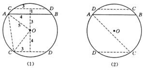 - Pada lingkaran $⊙O$, jari-jari $r=5$ cm dan $CD$ adalah dua tali busur sejajar dan $AB=8$ cm, $CD=6$ cm. Tentukan panjang tali busur $AC$.