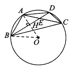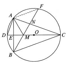 (iii) Hubungkan $AF\text{ }.\text{ }BF=AC\Rightarrow \widehat{BAF}=\widehat{AFC}$, maka $$\widehat{AB}=\widehat{FC}$$ yang menyiratkan bahwa $\angle CBF=\angle AFB$. Karena $\Delta ACM\cong \Delta BCM$, $$\angle AFM=\angle AFB=\angle CBF=\angle CBM=\angle CAM=\angle NAM,$$ oleh karena itu $\Delta MAN\sim\Delta MFA$, maka $\frac{MN}{MA}=\frac{MA}{MF}$, yaitu $$MA^2=MN\cdot MF,\text{ atau }BM^2=MN\cdot MF$$ karena $BM=AM$. - Lingkaran luar $⊙O$ dari segi empat $ABCD$ memiliki jari-jari $2$. $AC$ dan $BD$ berpotongan di titik $E$, sehingga $AE=EC$. Diketahui $AB=\sqrt{2}AE,BD=2\sqrt{3}$, tentukan luas dari $ABCD$.